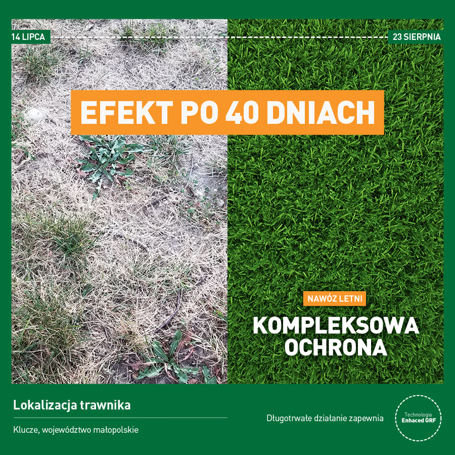 Warto pamiętać, że nawozy tradycyjne ulegają szybkiemu wypłukaniu, co powoduje niedobory pierwiastków w momencie, gdy rośliny intensywnie rosną i mają wyższe zapotrzebowanie na składniki pokarmowe. W przypadku pielęgnacji nawozem Mr. Green Grass, dzięki stałemu dostarczaniu składników pokarmowych, problem ten jest praktycznie wykluczony. Dlatego to właśnie innowacyjna technologia Enhanced GRF stanowi podstawę znakomitej skuteczności i wysokiej wydajności tego nawozu, by jak najlepiej dopasować się do potrzeb pokarmowych trawy w okresie do września.